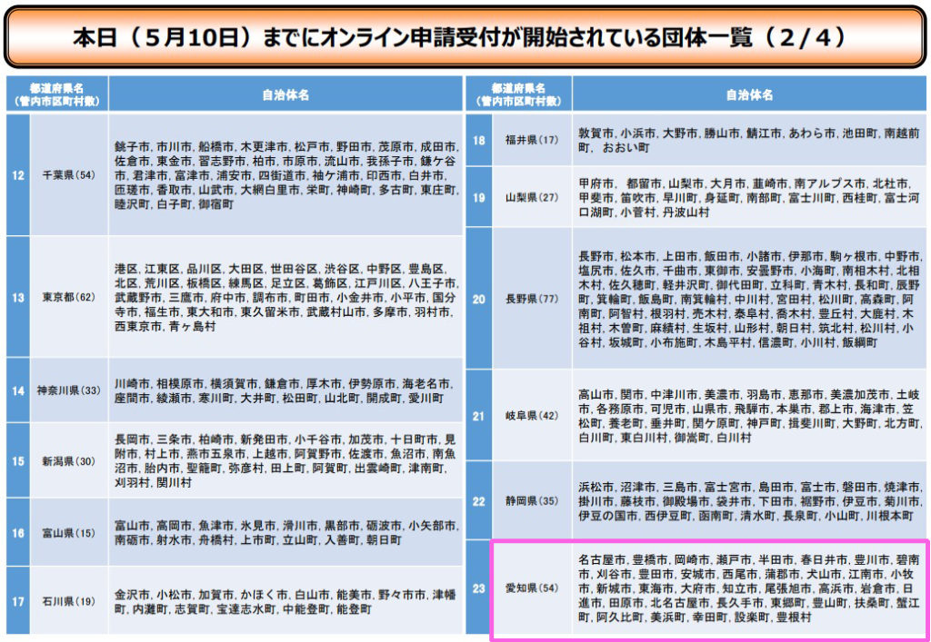 5月10日までにオンライン申請受付が開始されている自治体